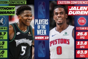 体育资讯3月3日讯 NBA官方公布了25-26赛季第19周东西部周最佳球员,东部活塞中锋杜伦当选,西部是爱德华兹。