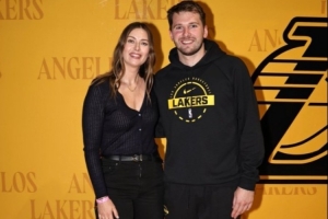 赛后,网坛名宿莎拉波娃和东契奇合影留念。