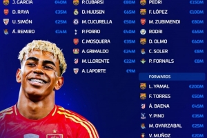 西班牙队总身价13亿欧,亚马尔2亿欧最高、佩德里1.5亿欧次席