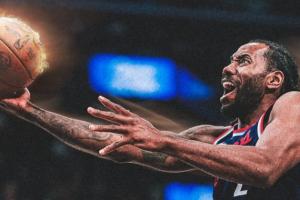 比赛第末节,快船当家球星科怀·伦纳德中距离干拔命中砍下本场第21分!