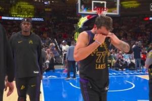 GIF-东契奇腿筋受伤后情绪处在崩溃边缘,摄影师追着拍,