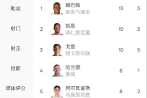 本赛季欧冠射手榜+助攻榜,皇马和拜仁球员占据前二