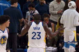 GIF-库里三分命中~!但吹了桑托斯先掩护犯规~!!
